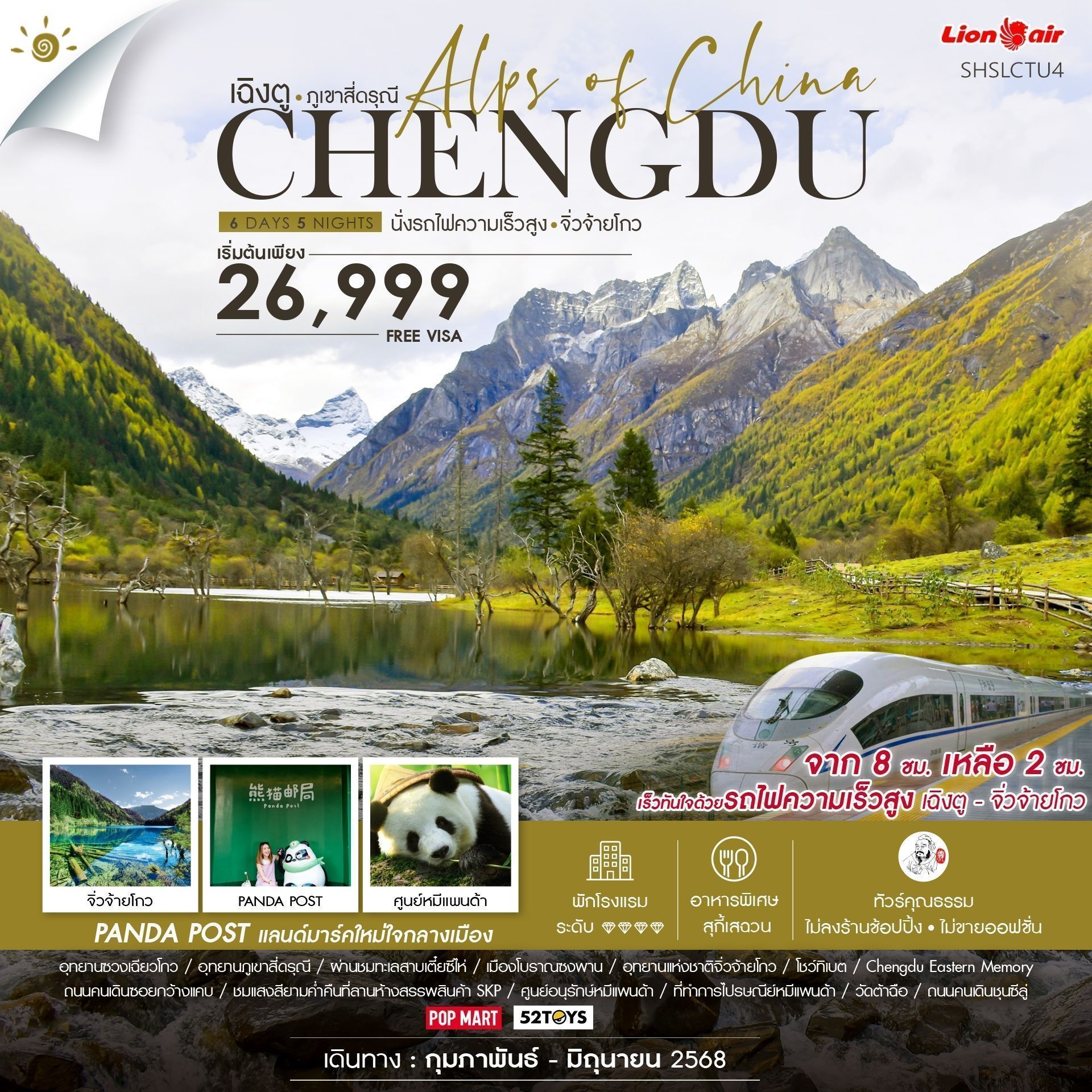 เฉิงตู ภูเขาสี่ดรุณี จิ่วจ้ายโกว (นั่งรถไฟ) 6 วัน 5 คืน (SL) นั่งรถไฟความเร็วสูงก่อนใคร จาก เฉิงตูสู่ จิ่วจ้ายโกว